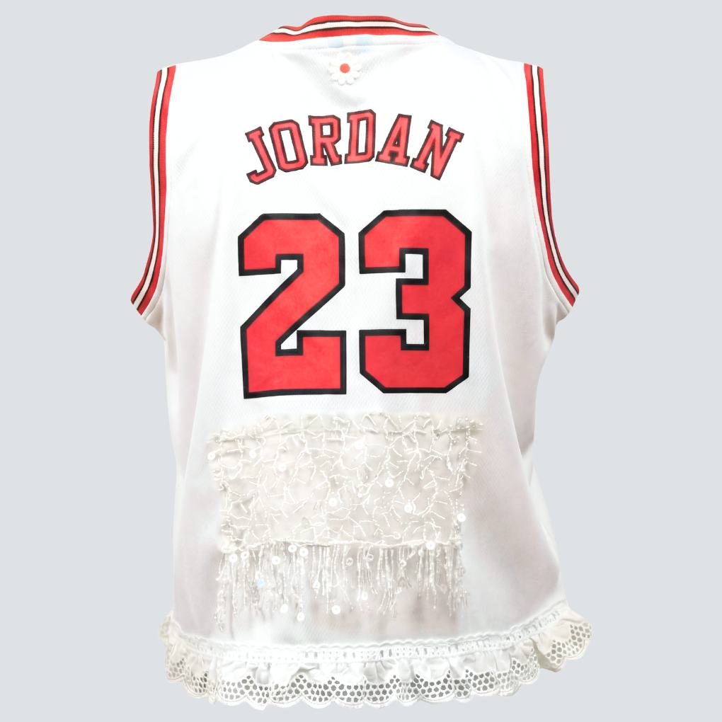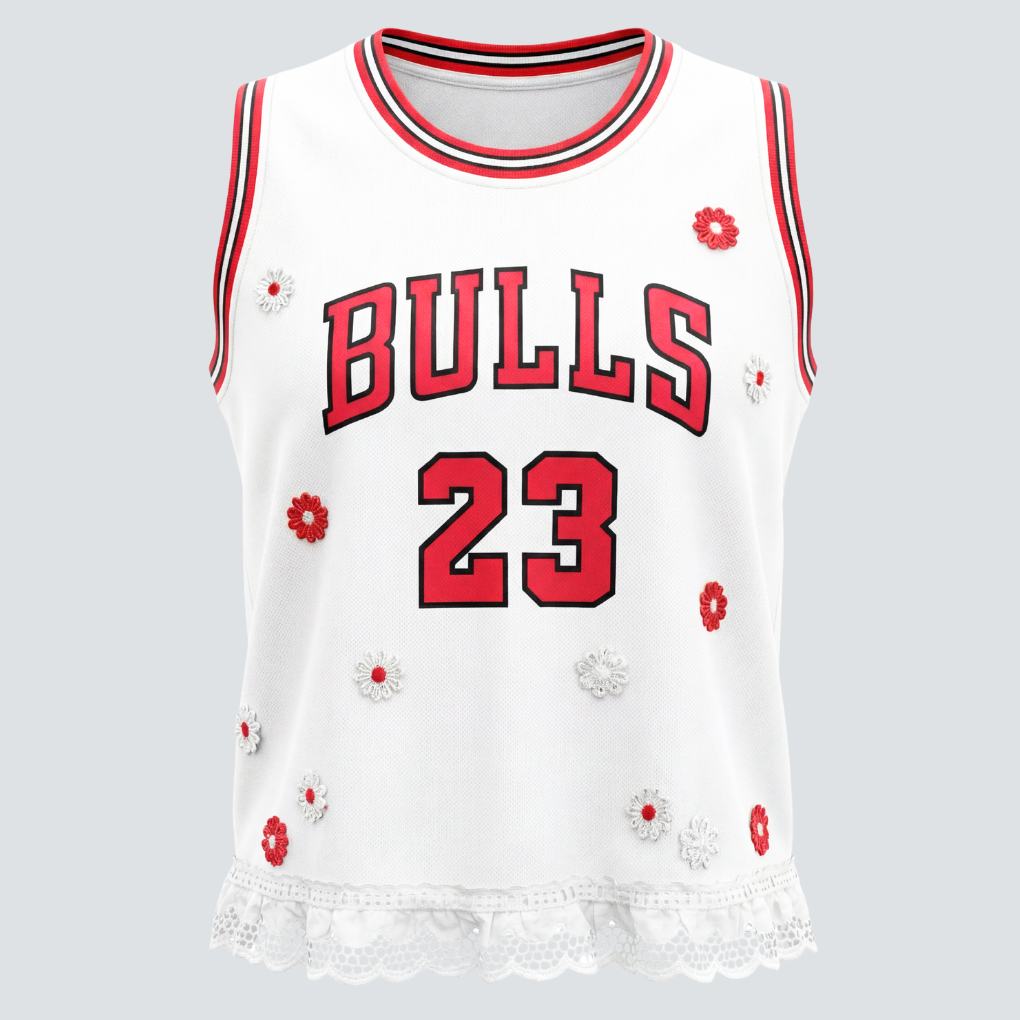 Maillot de basket Bulls upcyclé et revisité avec dentelle anglaise et fleurs. Le dos comprend une finition en sequins blancs.