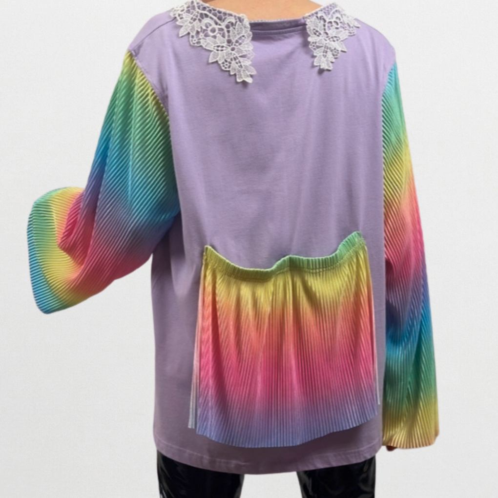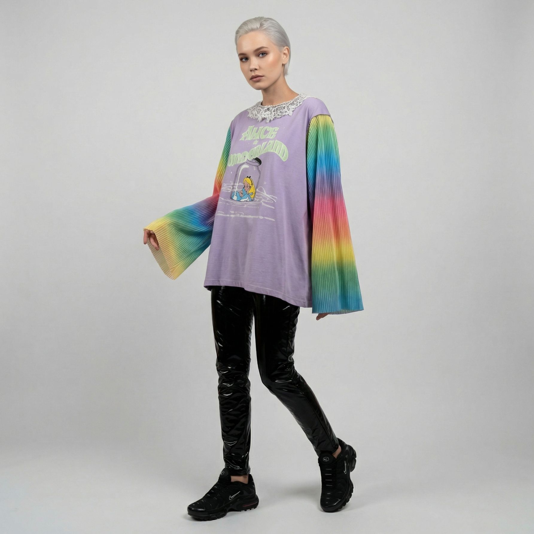 Tee shirt Alice au pays des merveilles revisité avec manches arc-en-ciel plissées et évasées (très longues & oversize). Volant plissé au dos. Col claudine en crochet avec ouverture à l’arrière.