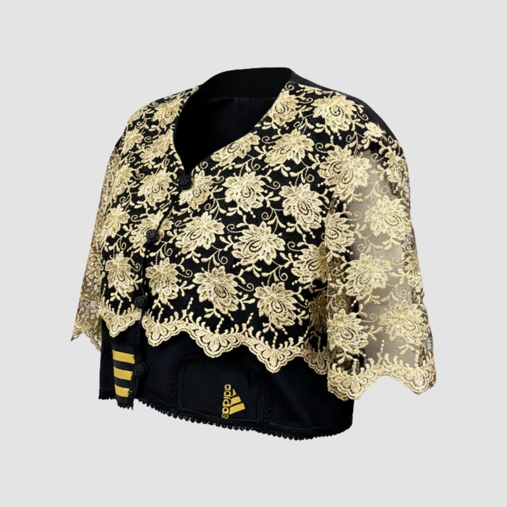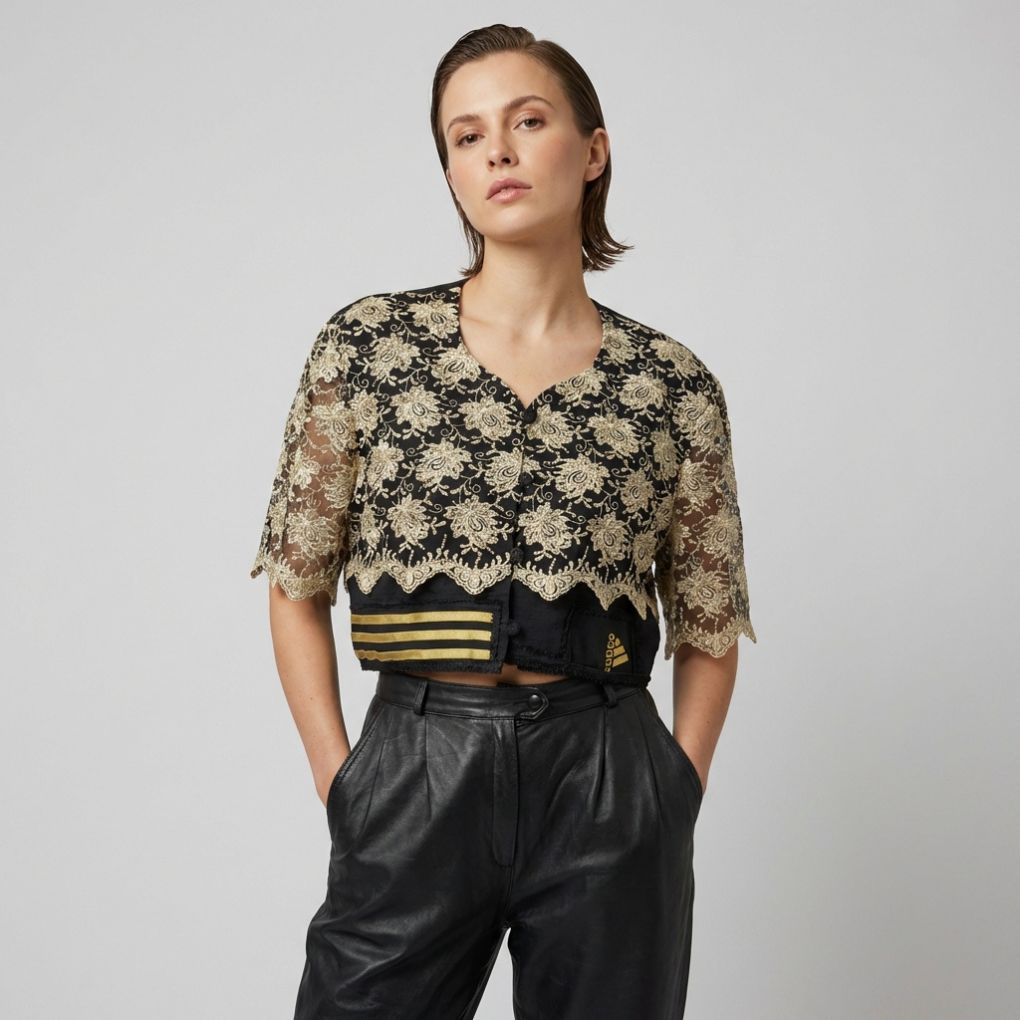Veste de tailleur courte Adidas reworked avec de la dentelle dorée.