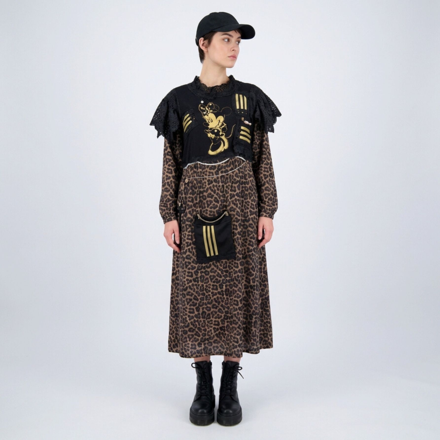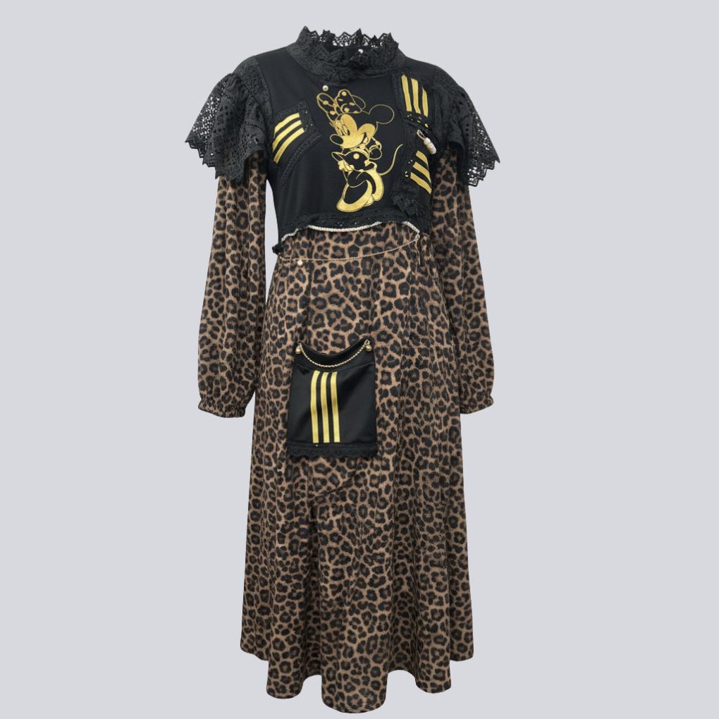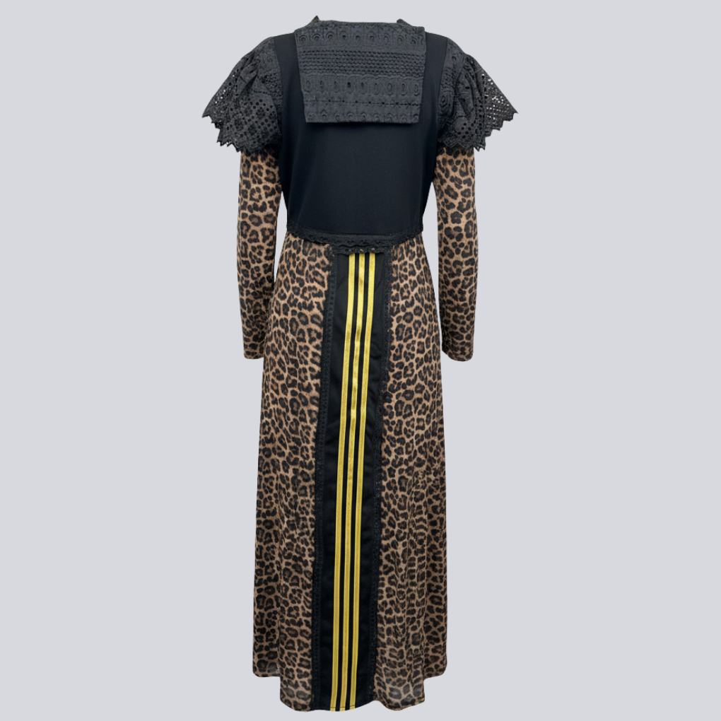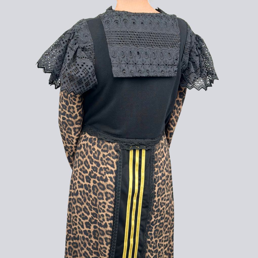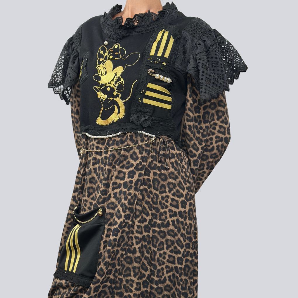 Robe Adidas revisitée avec jupe portefeuille motif léopard. Col marin. Finitions en dentelle, chaînes dorées et perles.