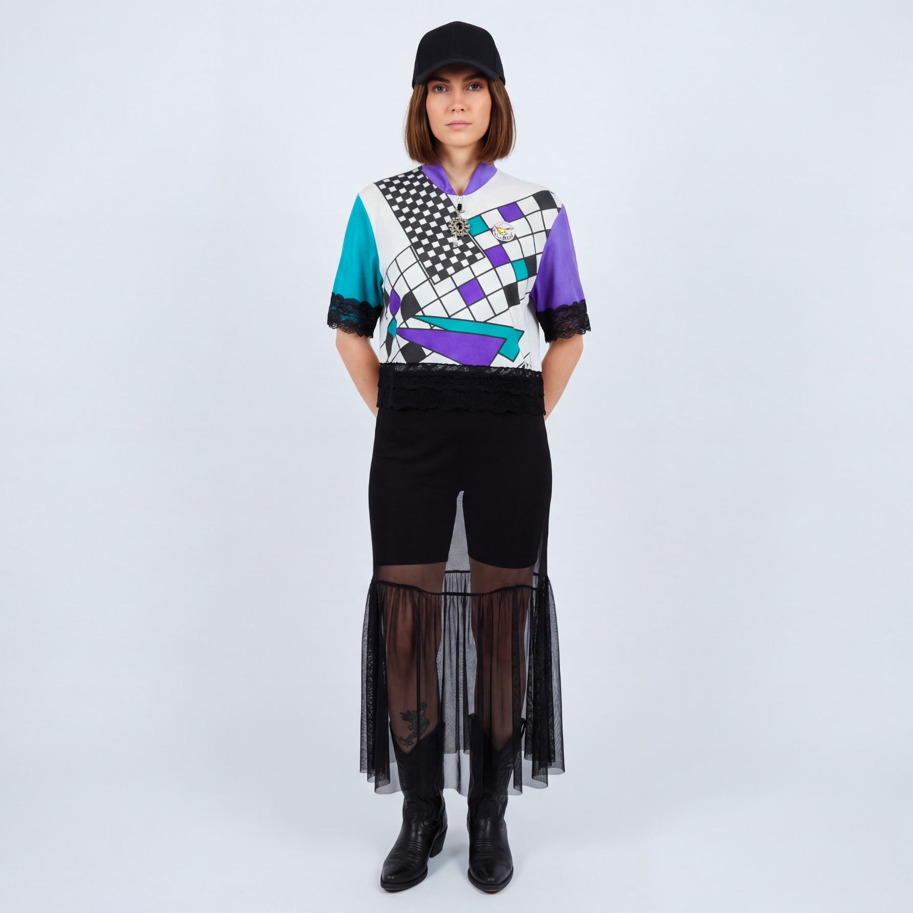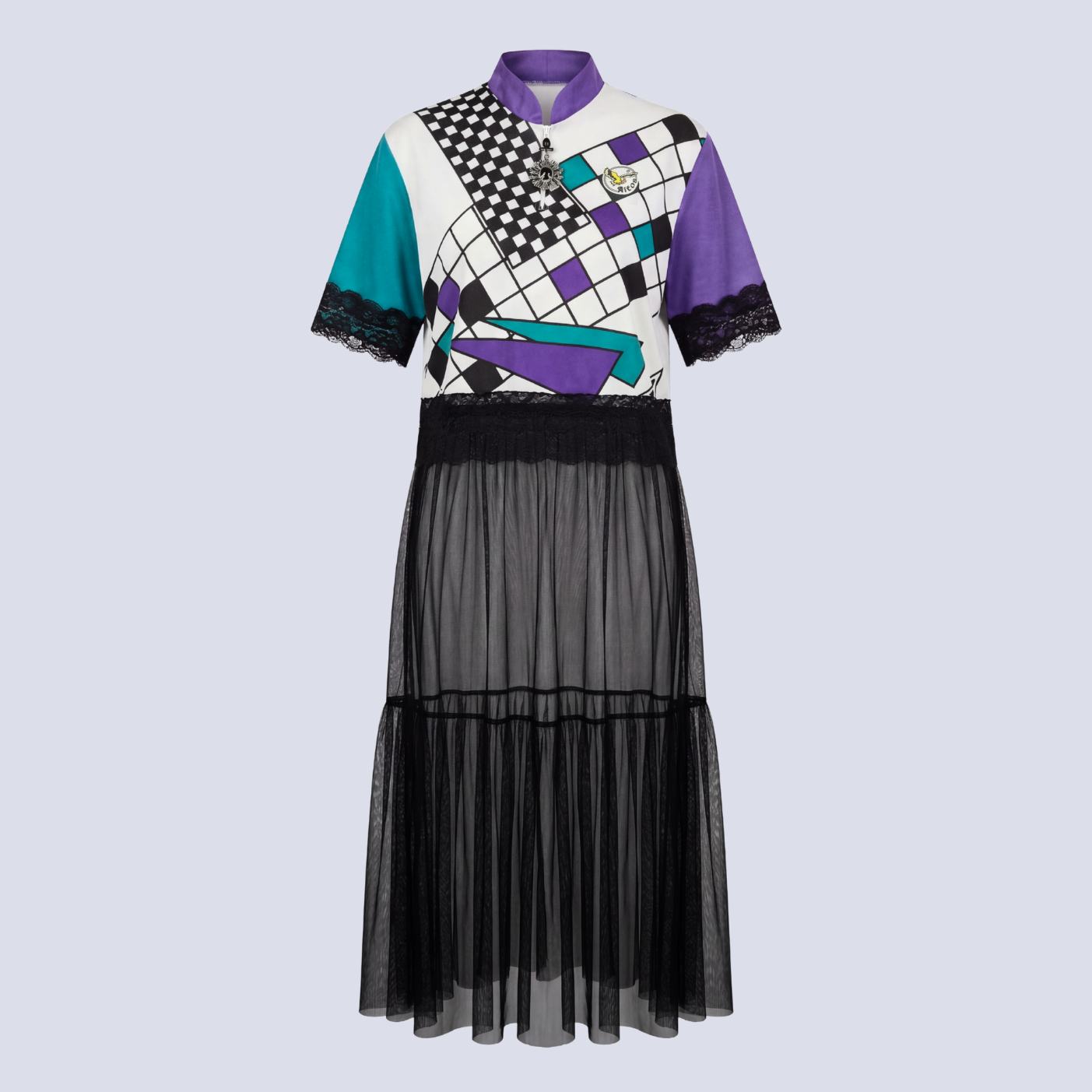 Robe cycliste avec jupe en tulle noir transparent, dentelles noires et bijou/broche en cristaux scintillants.