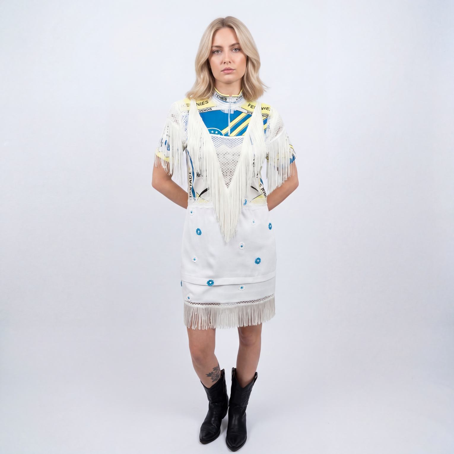Robe cycliste western avec des fleurs blanches et turquoises brodées… mais aussi des franges, des dentelles blanches et des épaulettes incrustées.